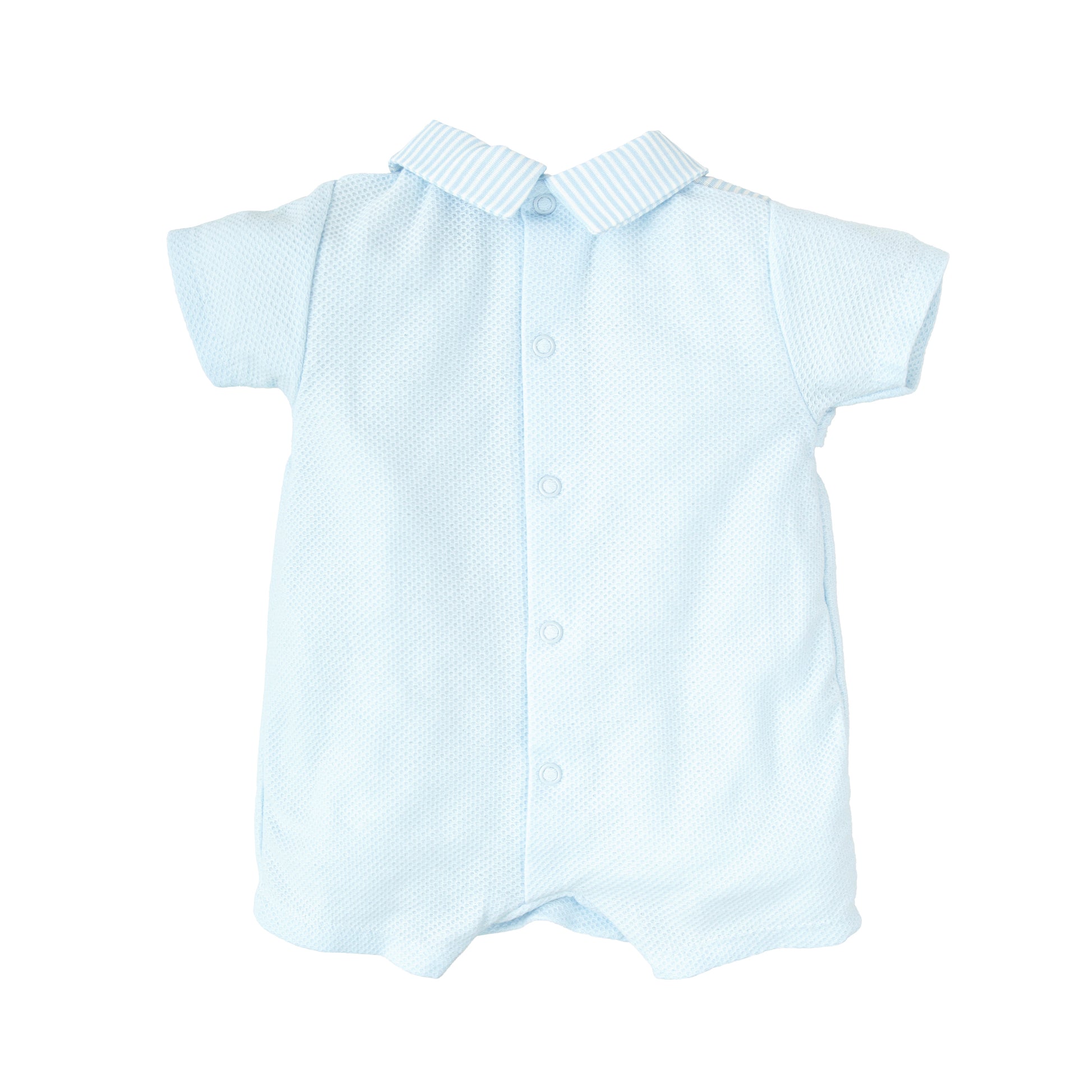 Dress your little one in timeless elegance with the Calma Cotton Knitted Romper for Boys by Babidu, beautifully crafted in Spain. This charming romper features a soft textured cotton knit fabric with a classic striped collar detail, offering both comfort and sophistication for special occasions or everyday wear.