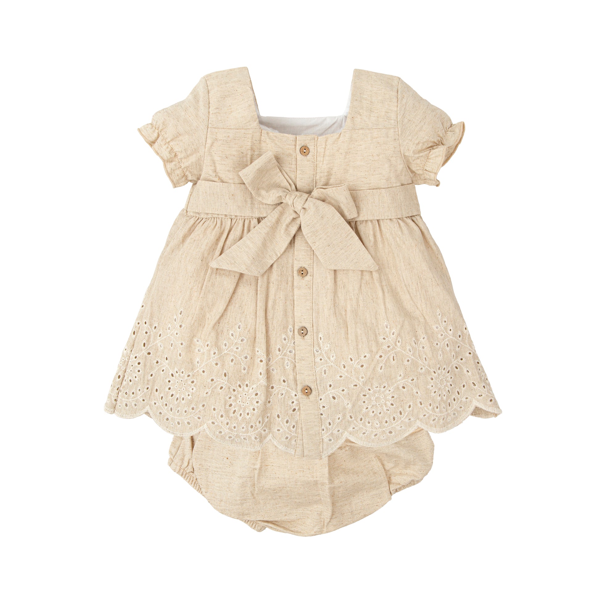 Dress your little princess in timeless elegance with our Deseo Woven Dress & Diaper Cover set. Made with lightweight and breathable 100% linen, this charming beige outfit features a pleated chest and delicate eyelet embroidery for a refined finish. Perfect for special occasions or everyday wear, your baby girl will look and feel comfortable and stylish.