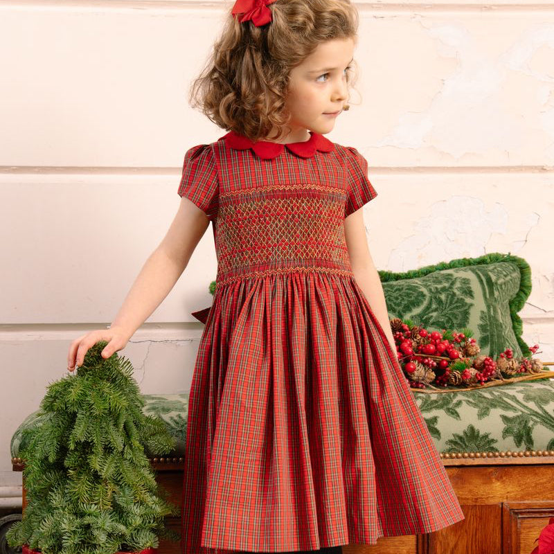 Capture the spirit of the holidays with the Marguerite Red Tartan Smocked Dress, featuring delicate hand-smocked red and gold embroidery for festive elegance. Its vintage-inspired daisy collar and balloon sleeves add nostalgic charm, while the reversible back bow ensures a perfect fit. Made from breathable 100% cotton tartan fabric sourced from Spain, this dress offers both comfort and style. Complete with matching bloomers, it’s the ideal holiday outfit to create lasting seasonal memories.