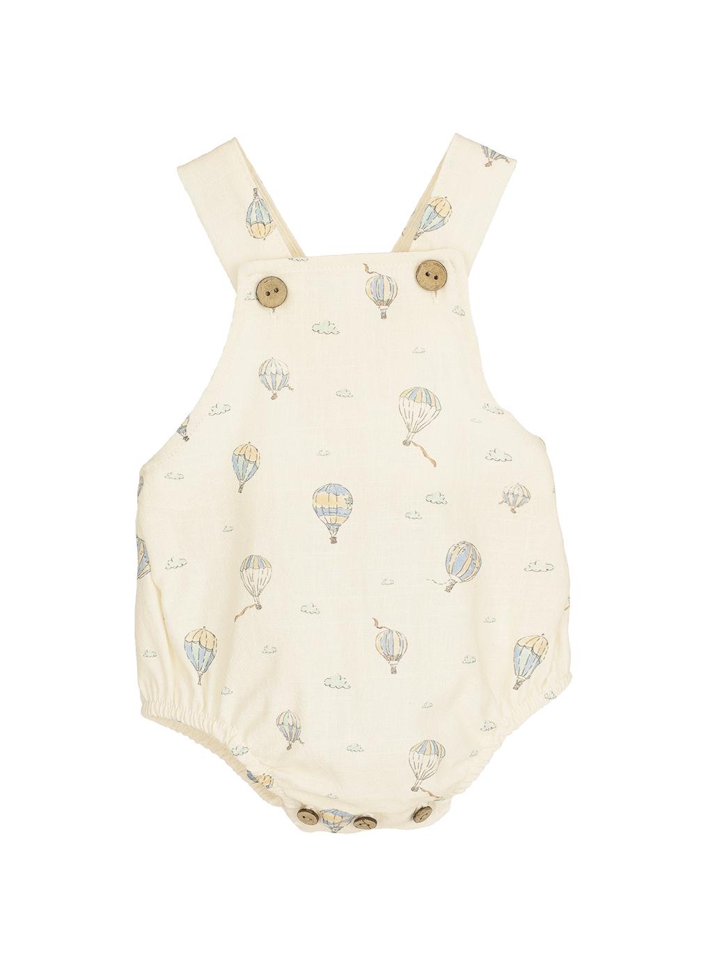 Featuring a charming hot air balloon print, wooden button details, and snap closures for easy changing, it’s the perfect everyday essential for babies. The lightweight fabric is gentle on delicate skin, making it ideal for playtime, outings, or special occasions.
